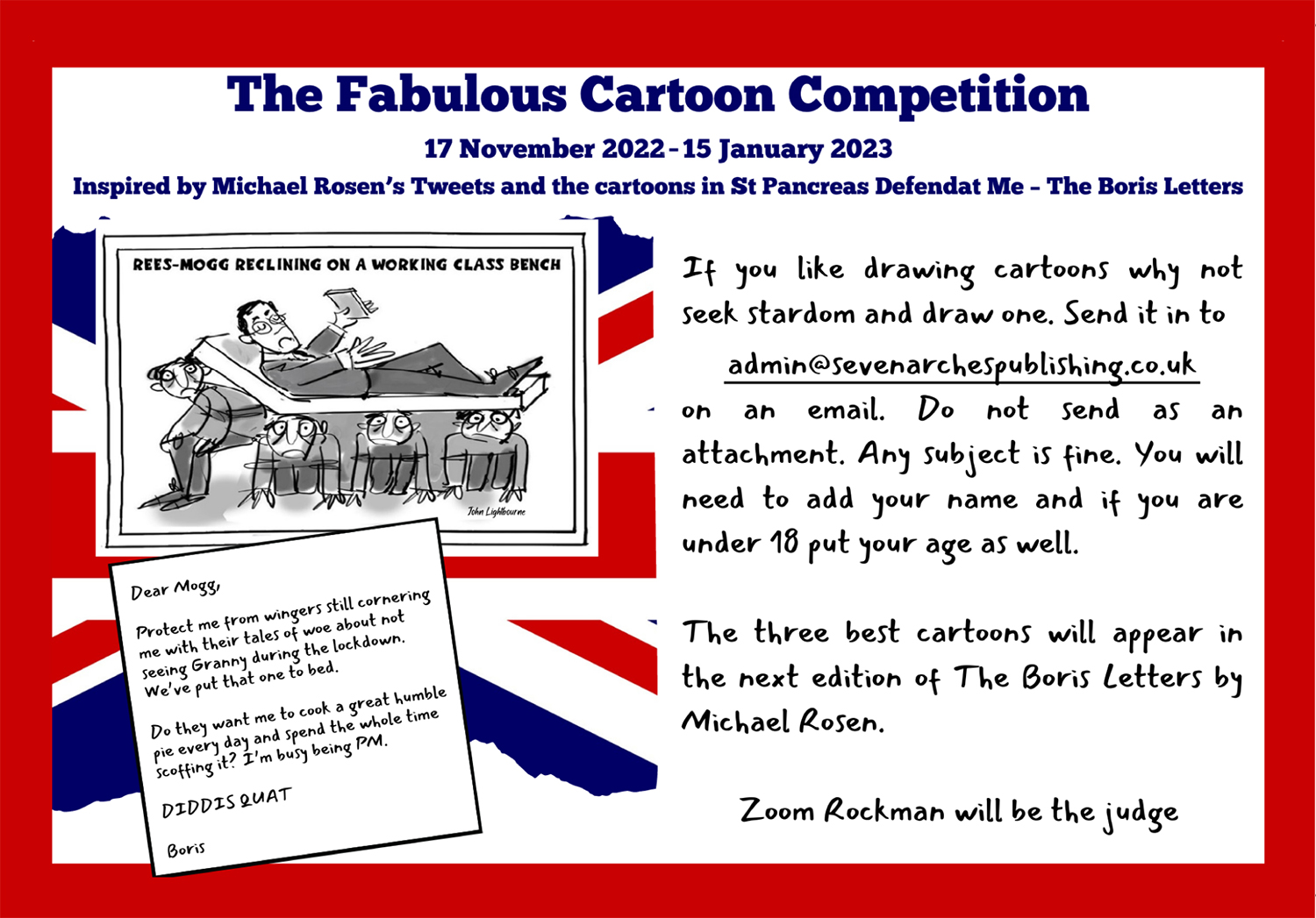You can use our email address: admin@sevenarchespublishing.co.uk to send in your cartoons. Or post any entries to: